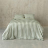 Sage green stripe duvet cover set on a bed, with a neutral background. Close up of a sage green and light green stripe duvet cover set on a bed, with sage green sheets and pillowcases. Close up of a sage green and light green stripe duvet cover magnetic corner. Montana stripe duvet cover paired with coral bed bedding set, against a beige curtain backdrop. A marble bed side table and lamp featured in the corner. Close up of a sage green and light green stripe duvet cover set on a bed, with sage green sheets and pillowcases.