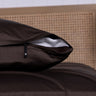 Chocolate brown invisible-zipper pillowcase. Brown bed sheets and pillows on a bed with a white wall and lamp in the background.